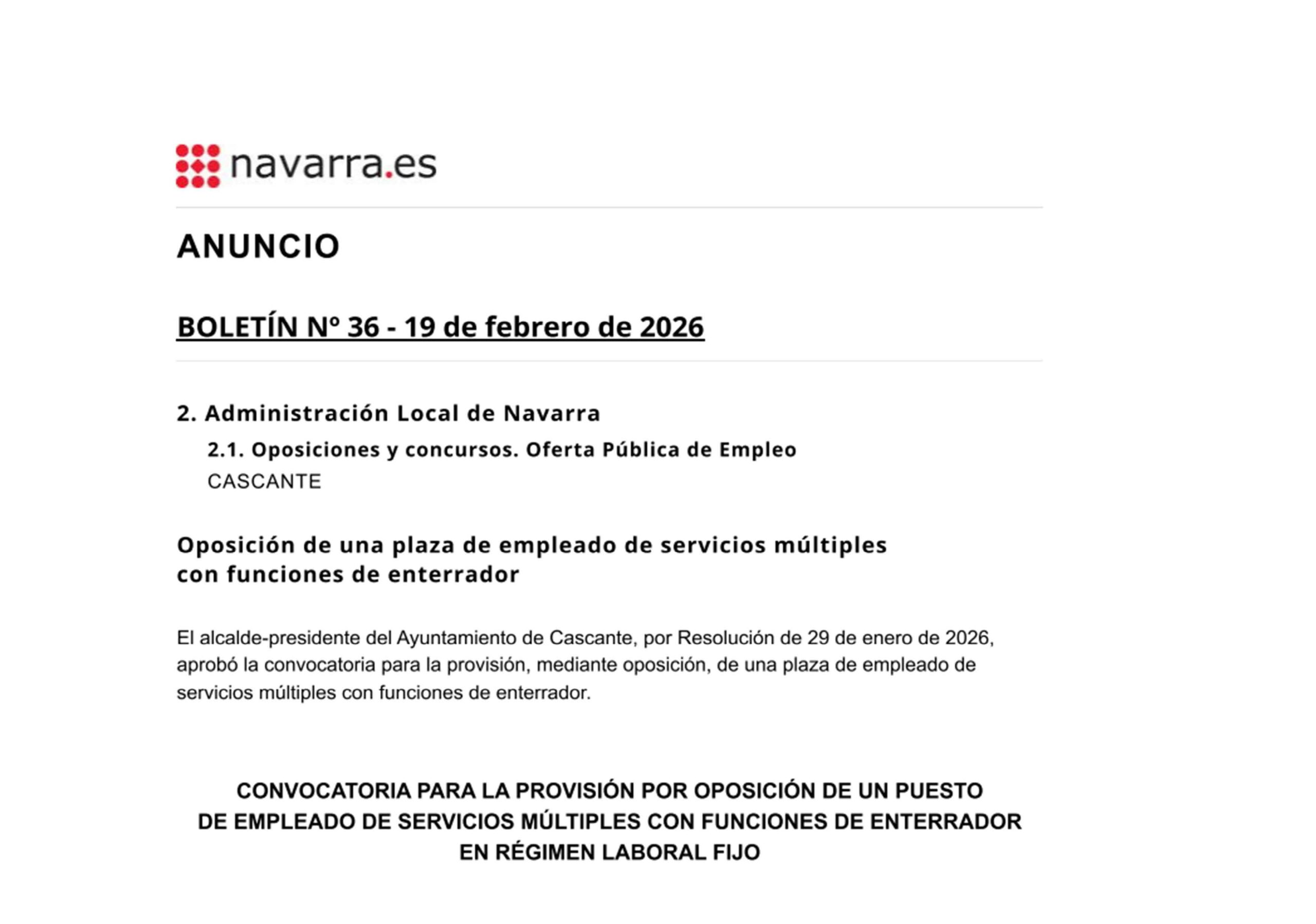 CONVOCADA PLAZA DE EMPLEADO DE SERVICIOS MULTIPLES CON FUNCIONES DE ENTERRADOR